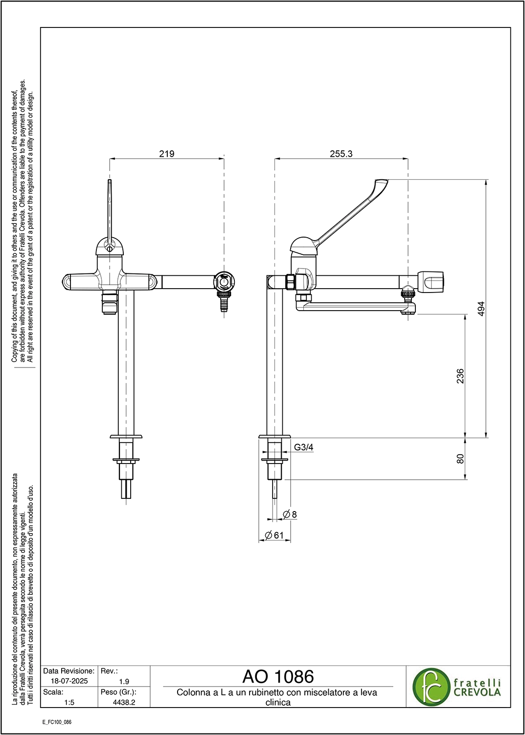 Colonna a L a un rubinetto con miscelatore a leva clinica