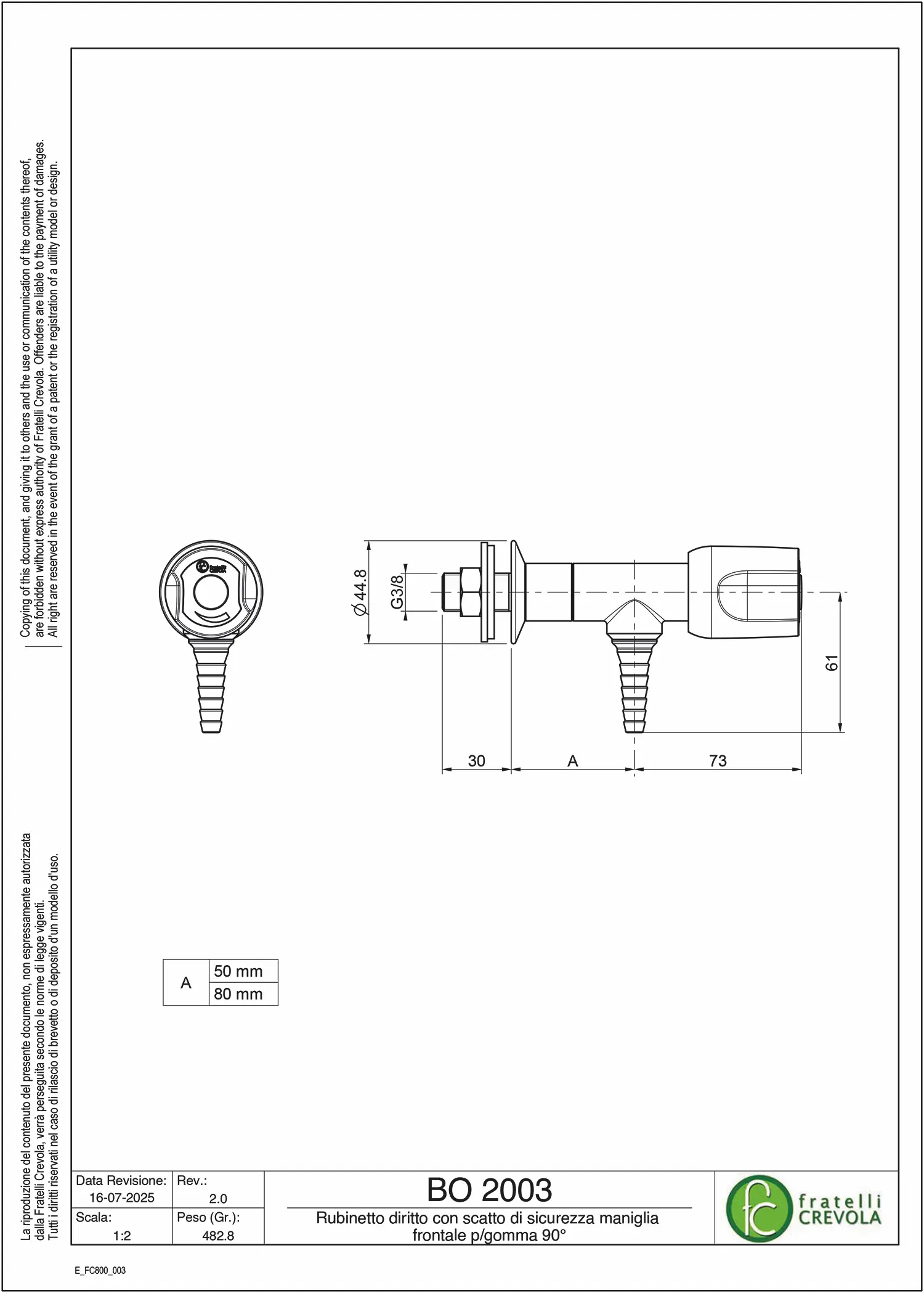Rubinetto diritto con scatto di sicurezza maniglia frontale p/gomma 90°