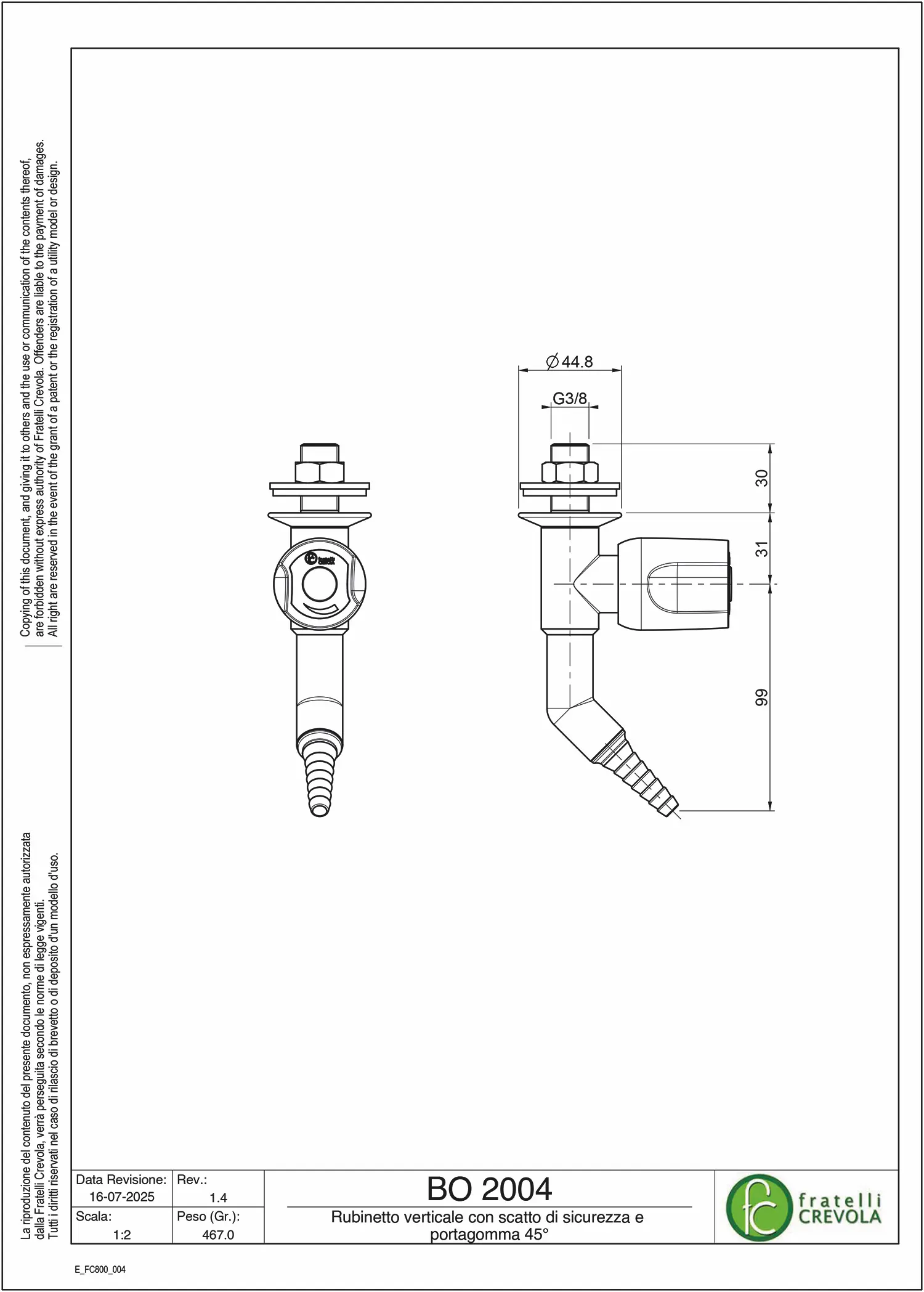 La rubinetteria per gas combustibili è dotata di vitone ceramico con scatto di sicurezza. Portagomma fisso secondo la norma DIN 12898.