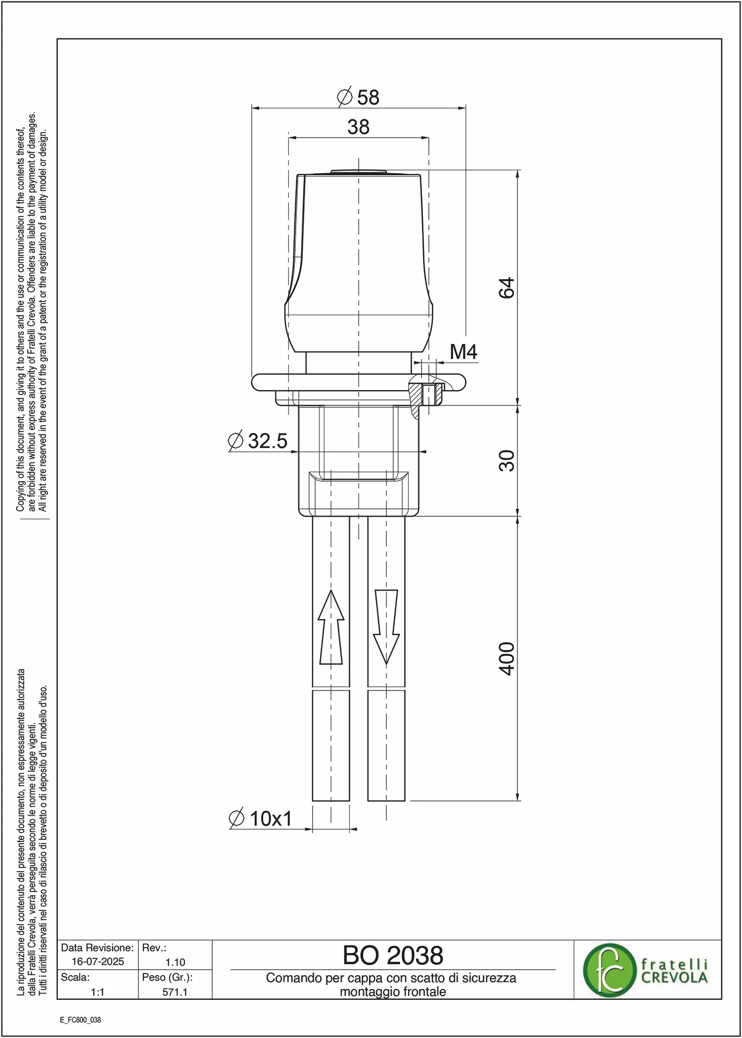 Comando per cappa montaggio frontale con scatto di sicurezza e tubi rame