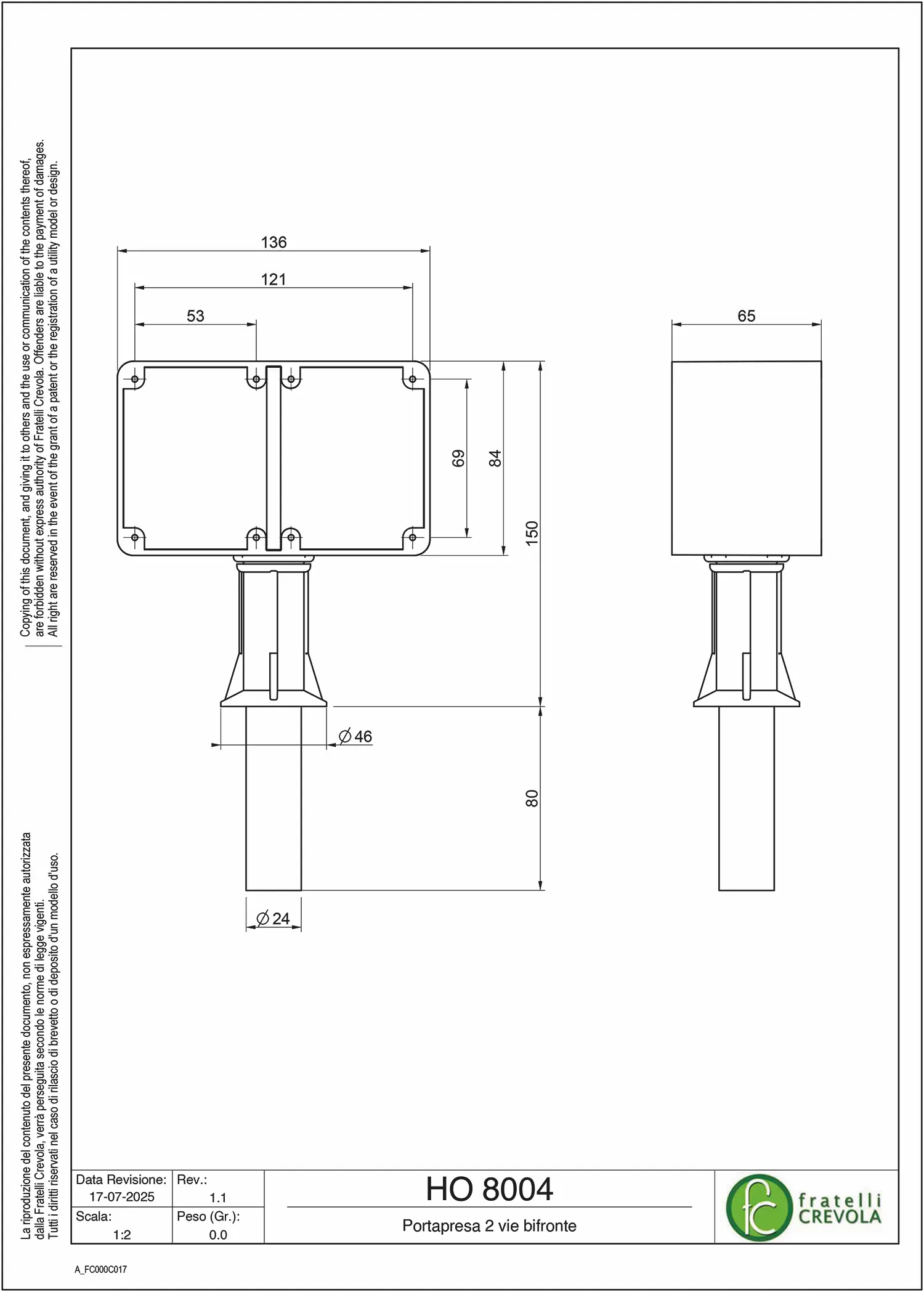 Parte filettata da 3/4″ (Ø24) con foro passante per passaggio cavi, kit di fissaggio (guarnizione, flangia e dado) incluso.