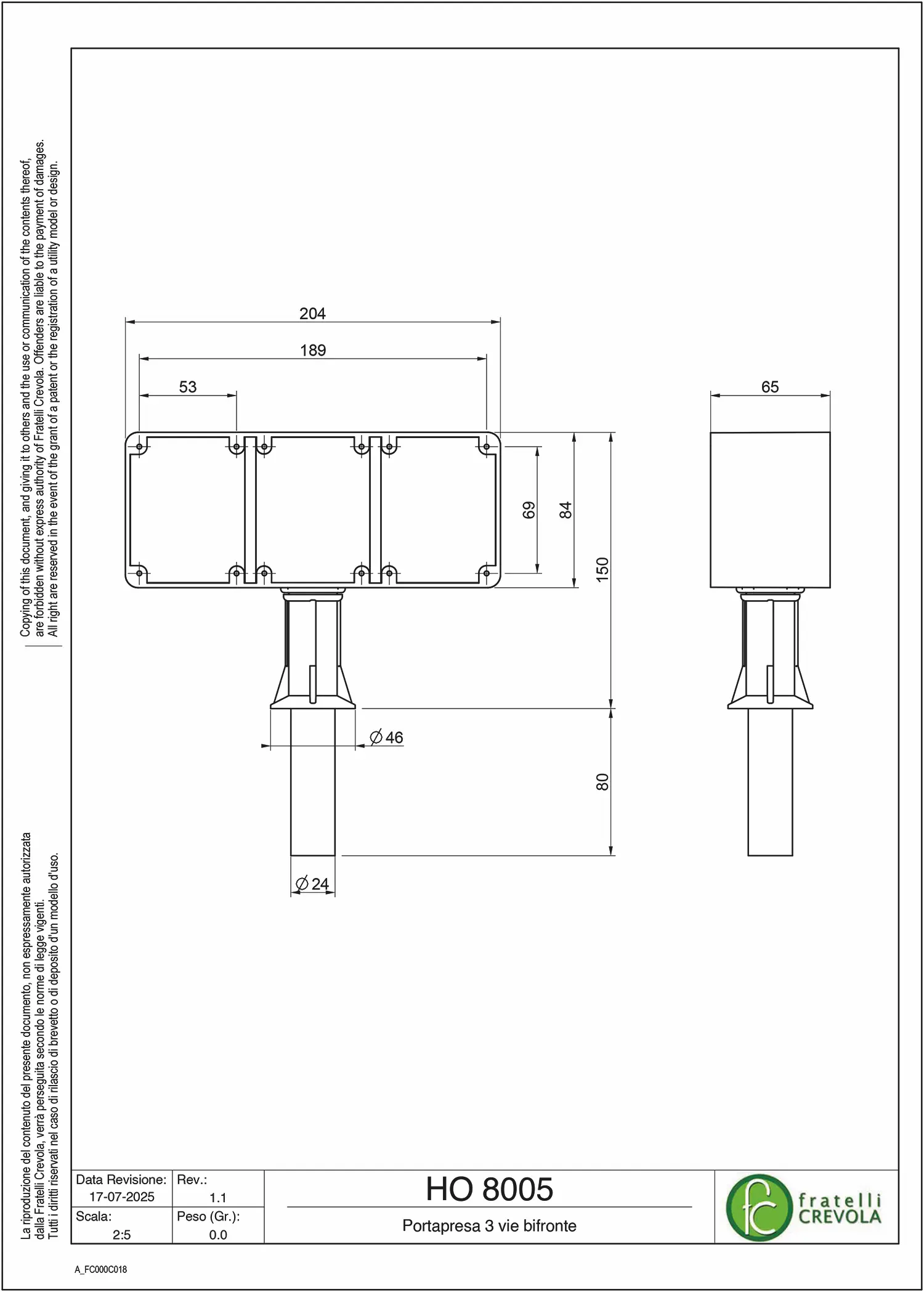 Parte filettata da 3/4″ (Ø24) con foro passante per passaggio cavi, kit di fissaggio (guarnizione, flangia e dado) incluso.