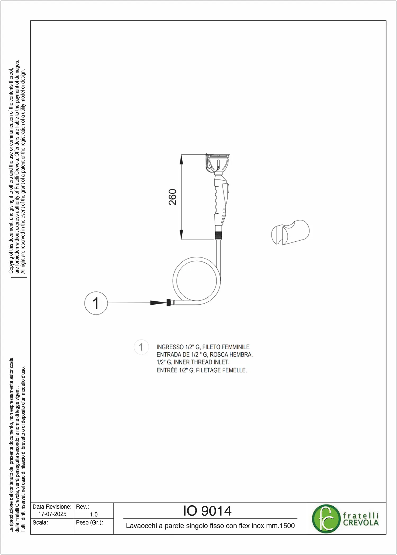 Lavaocchi a parete singolo fisso con flex inox mm.1500