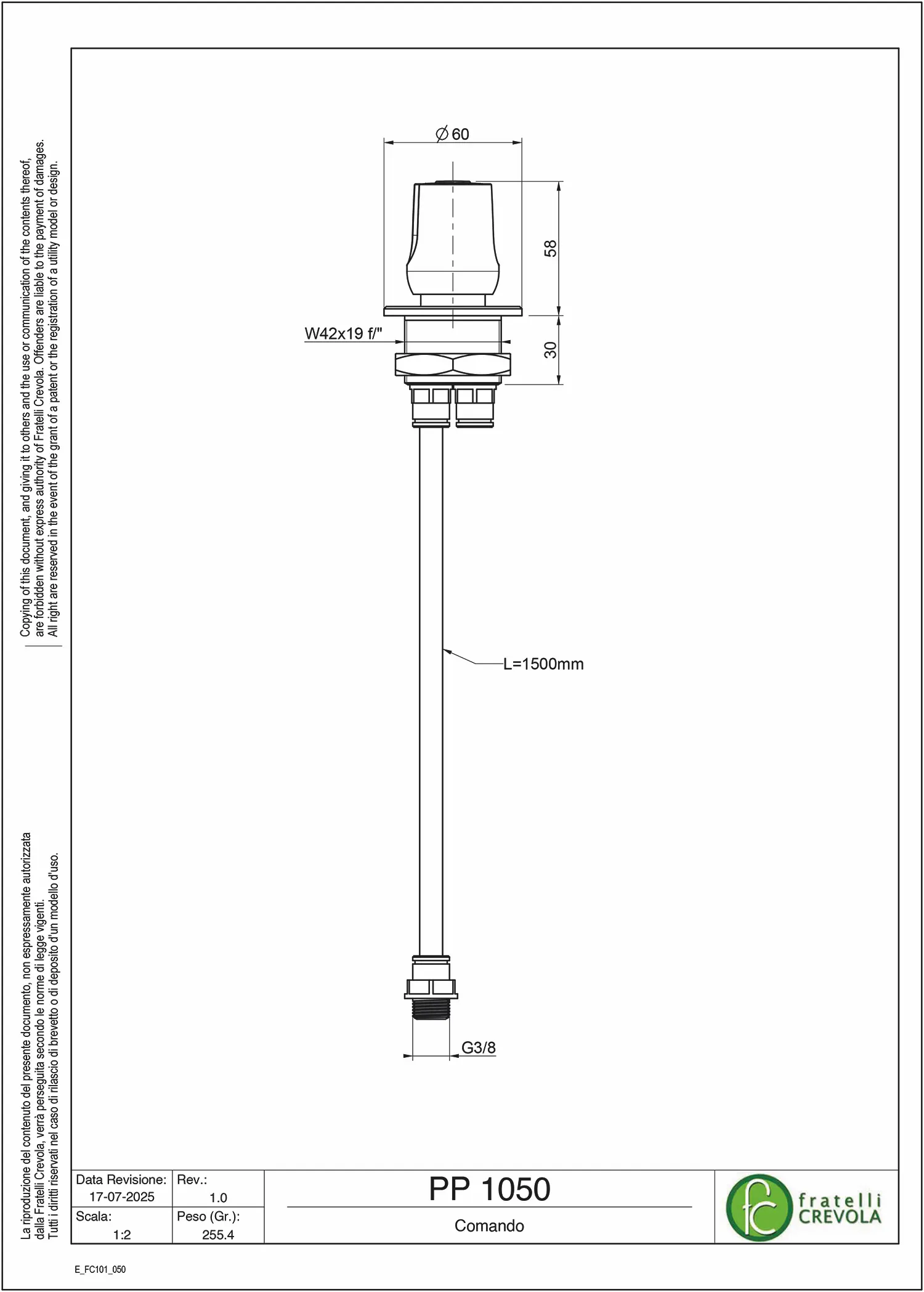 Alimentazione 1/2”, filettature secondo la norma ISO 228/1, classe di tolleranza B. Rivestimento esterno delle parti in ottone con verniciatura a polvere epossidica.